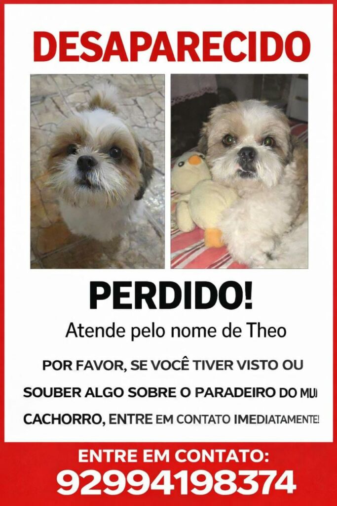 Uma família está à procura de seu animal de estimação, um cachorro da raça Shih-tzu (ou similar) de pequeno porte, que desapareceu recentemente na capital amazonense. De acordo com o cartaz de busca, o animal atende pelo nome de ‘Theo’.