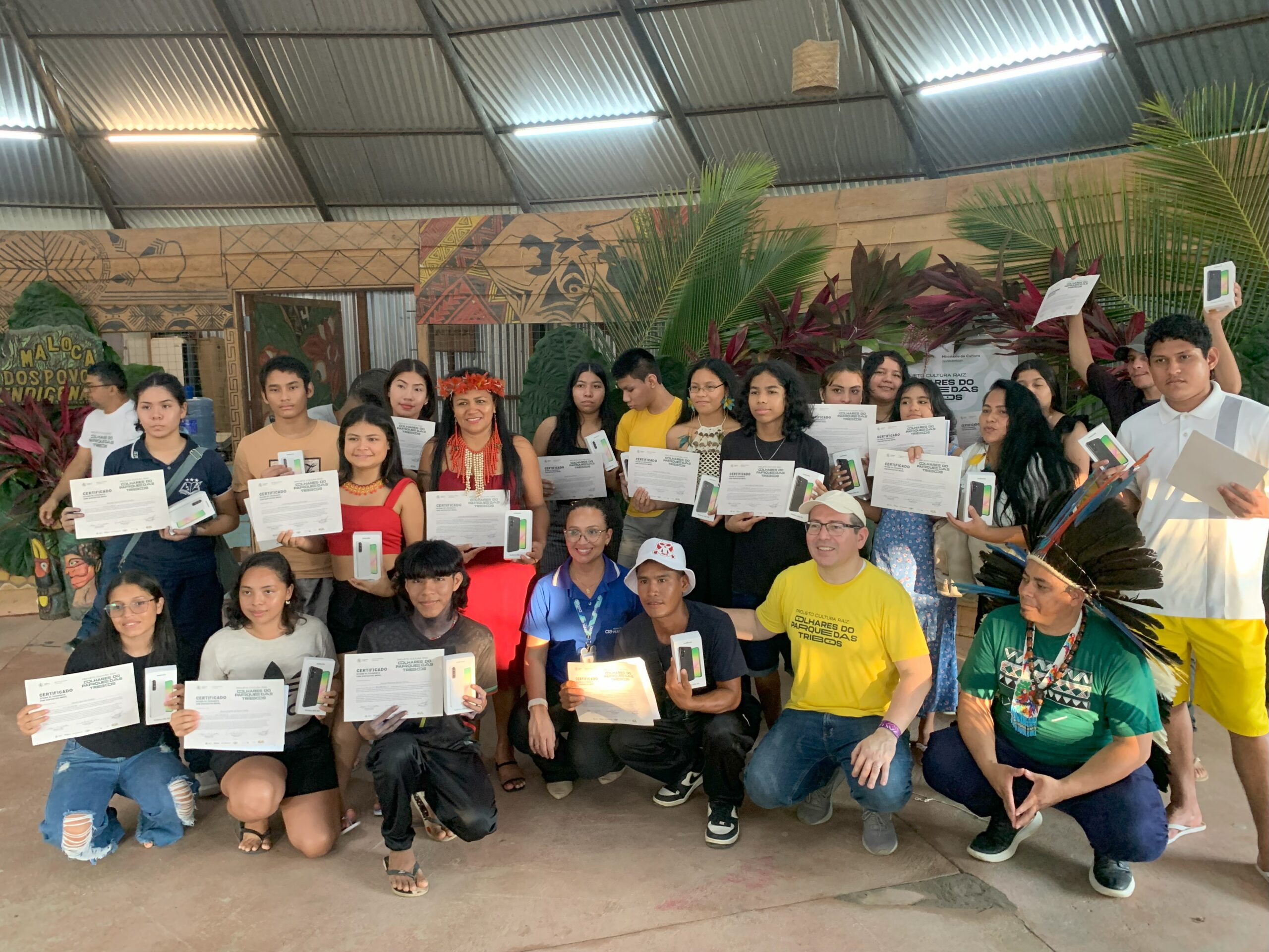 Participaram da formação 20 jovens indígenas que ao final do curso receberam seus certificados de conclusão e foram contemplados com aparelhos celulares, como forma de reconhecimento pelo alto índice de frequência, acima de 80% ao longo da Oficina. Os aparelhos deverão ser usados exclusivamente em ações comunitárias, conforme previsto no termo de responsabilidade assinado pelos participantes, que permanecerão vinculados ao Projeto Cultura Raiz por dois anos.