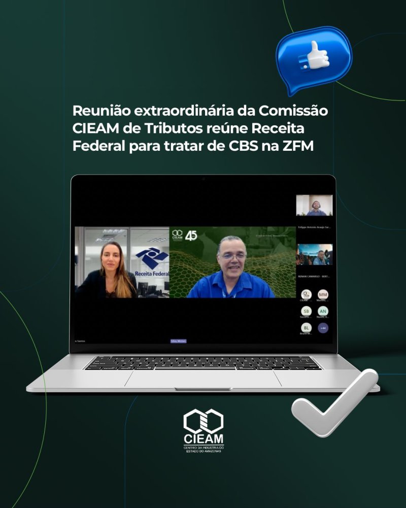 A Comissão CIEAM de Tributos do Centro da Indústria do Estado do Amazonas (CIEAM) realizou, nesta quarta-feira (19/11), uma reunião extraordinária voltada aos profissionais de tributos, contabilidade, auditoria fiscal e economia, com participação de representantes da Receita Federal do Brasil. O encontro, conduzido pelo Coordenador da Comissão, Moisés Silva, buscou esclarecer pontos técnicos relacionados à Apuração Assistida da Contribuição sobre Bens e Serviços (CBS) e aos Créditos Presumidos aplicáveis na Zona Franca de Manaus (ZFM).